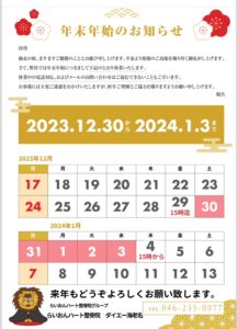 2023年12月30日~2024年1月3日まで休診とさせて頂きます。年内は12月29日15時まで年始は1月4日15時からとなっております。休診中の電話対応、およびメール、LINEのお問い合わせはご返信できないこともござい […]